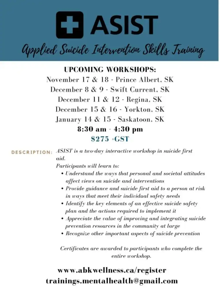 ASISTOctober 29, 2025Event Applied Suicide Intervention Skills Training Previous Post DIY Christmas Door Swag Night Next Post Loon Lake RCMP Reminder