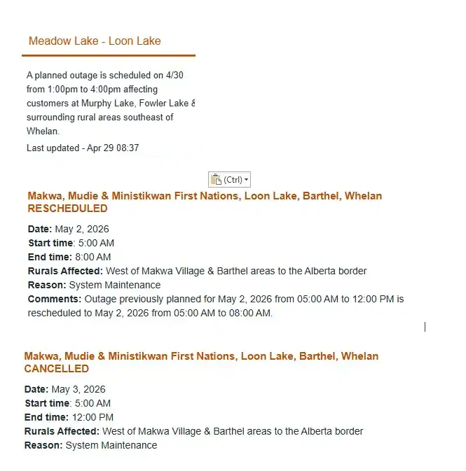 May 2 – *UPDATED* 5:00am to 8:00am for areas west of Makwa Village and Barthel Areas to the Alberta border.