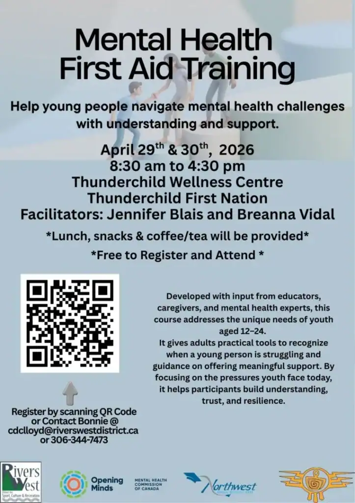 Rivers West Mental Health First AidFebruary 24, 2026Event To Register, or for more information Click the Link, https://form.jotform.com/260476190586263 Scan the QR code Contact Bonnie at cdclloyd@riverswestdistrict.ca Phone 306-344-7473 Previous Post Sealand Quality Foods Truck